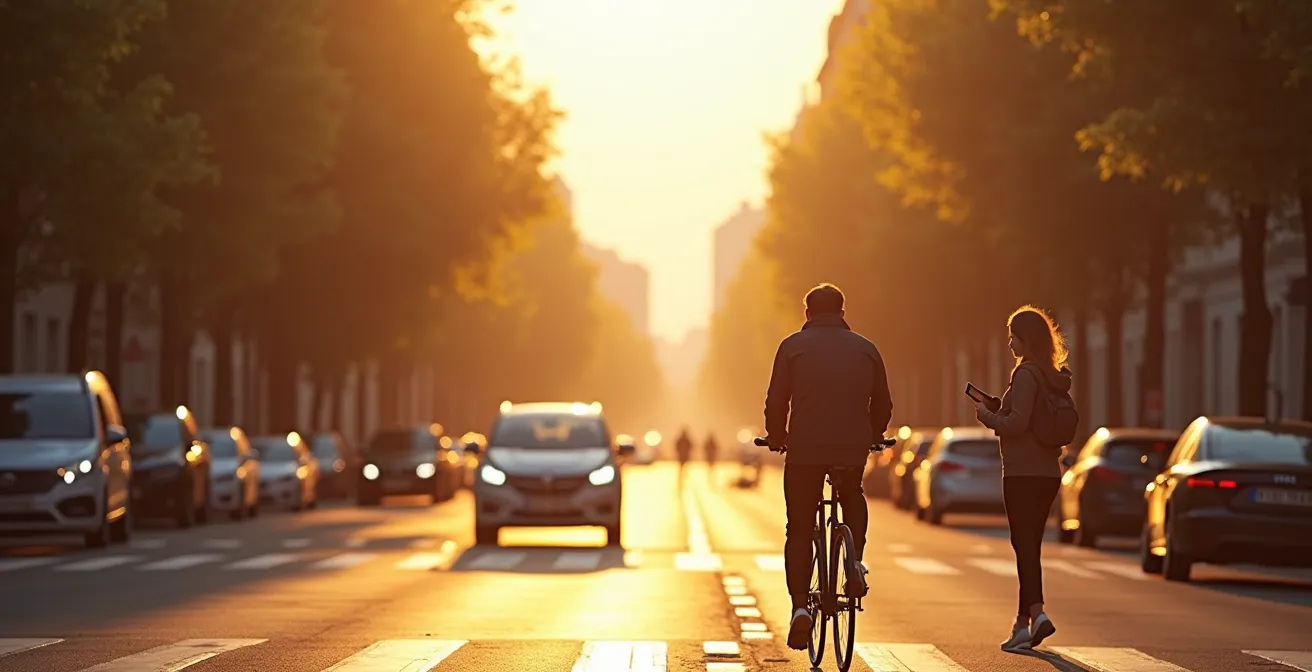 La première est la Règle de l’Anticipation Paranoïaque. Il s’agit de partir systématiquement du pire scénario : supposer que chaque portière va s’ouvrir, que chaque voiture en attente va démarrer sans préavis, et que chaque piéton peut changer de direction à tout moment. Cette « paranoïa » n’est pas une source de stress, mais un puissant outil de vigilance qui permet de toujours garder une marge de manœuvre et une trajectoire de repli. La seconde est la Règle de l’Empathie Stratégique : ne jamais se placer dans un angle mort. Il faut se mettre à la place du conducteur et se demander : « Me voit-il ? ». Se positionner non pas où l’on a le droit d’être, mais là où l’on est le plus visible, est la meilleure assurance-vie du cycliste.
